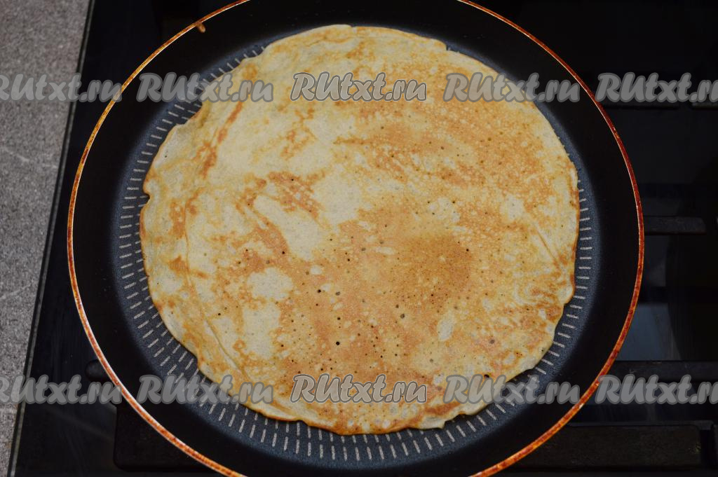 Затем блин перевернуть (переворачивается он очень легко) и продолжать обжаривать до золотистого цвета с другой стороны. Готовый аппетитный блинчик переложить на тарелку. Постепенно, периодически перемешивая тесто, чтобы оно не застаивалось, пожарить все блины.