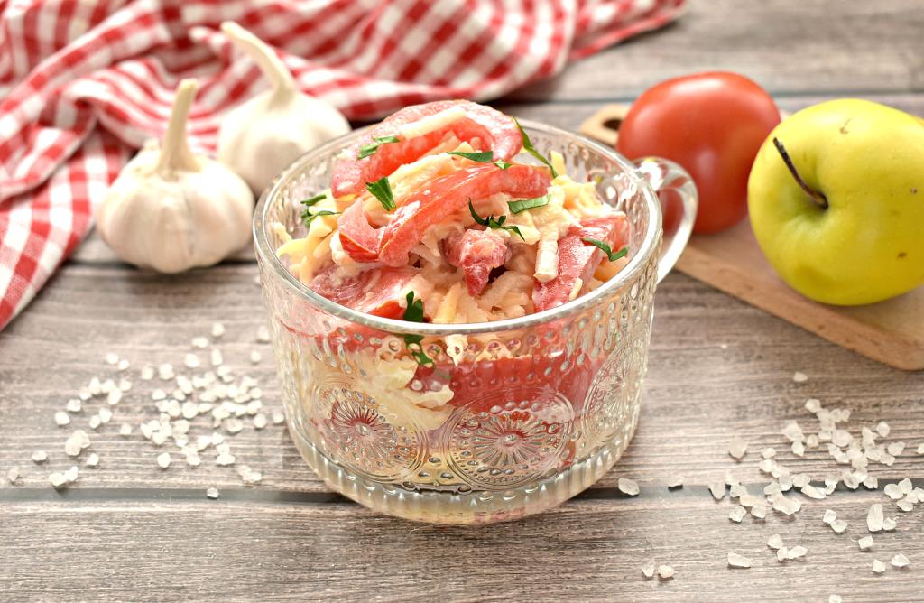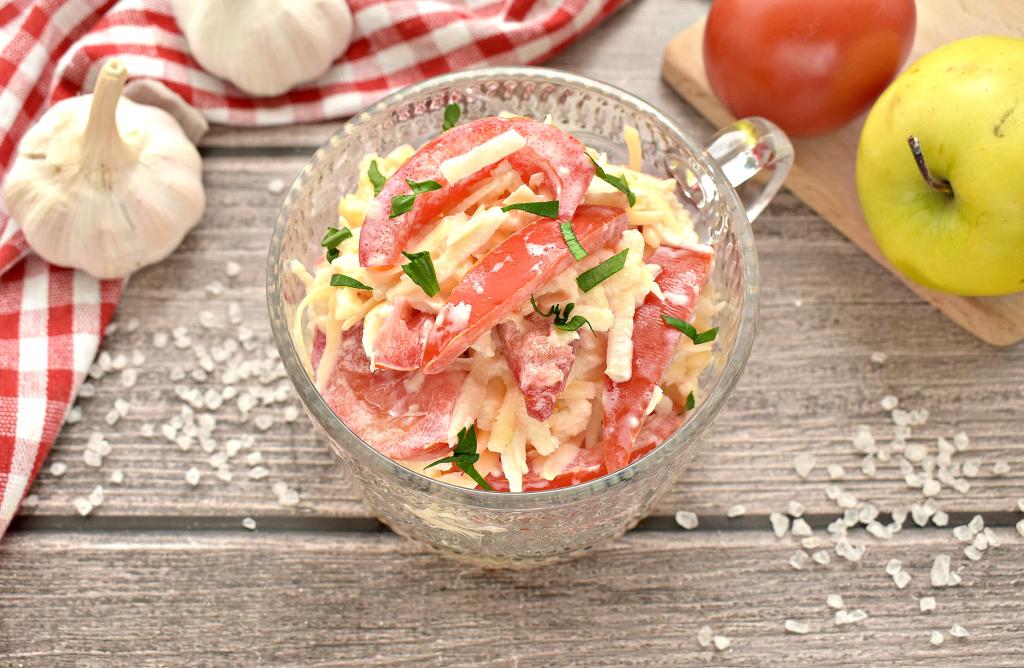 Яблоко (лучше взять с кислинкой), очищенное от кожуры, натираем на крупной тёрке, удаляя семенную коробку, и перекладываем в салат из сыра и помидоров.