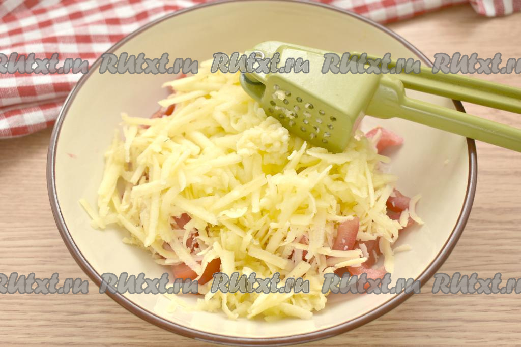 Сюда же добавляем пропущенный через пресс (или натёртый на мелкой тёрке) чеснок.