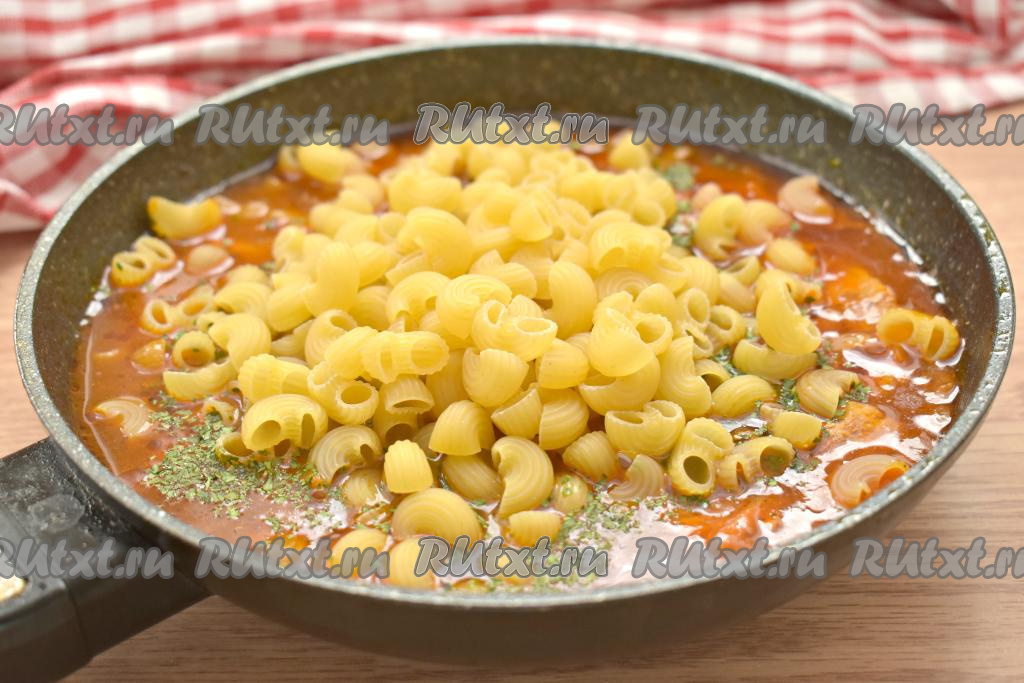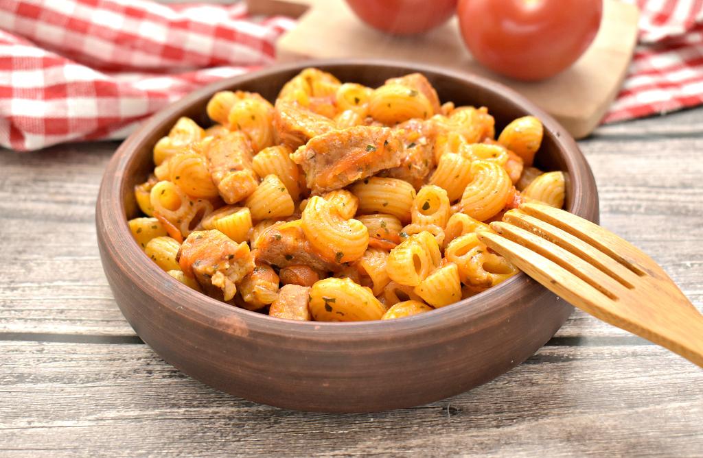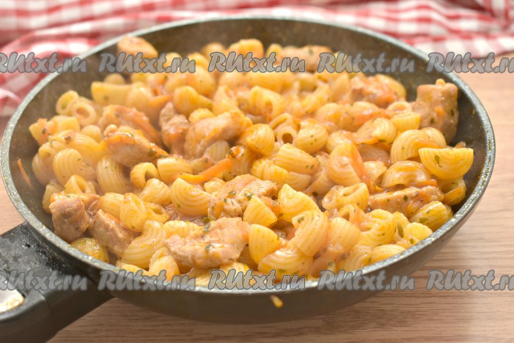 Готовим под крышкой макароны со свининой в томатном соусе примерно 10 минут (ориентируйтесь на сорт макаронных изделий, которые вы готовите, макароны должны стать достаточно мягкими, но они не должны перевариться). За это время несколько раз блюдо можно перемешать.