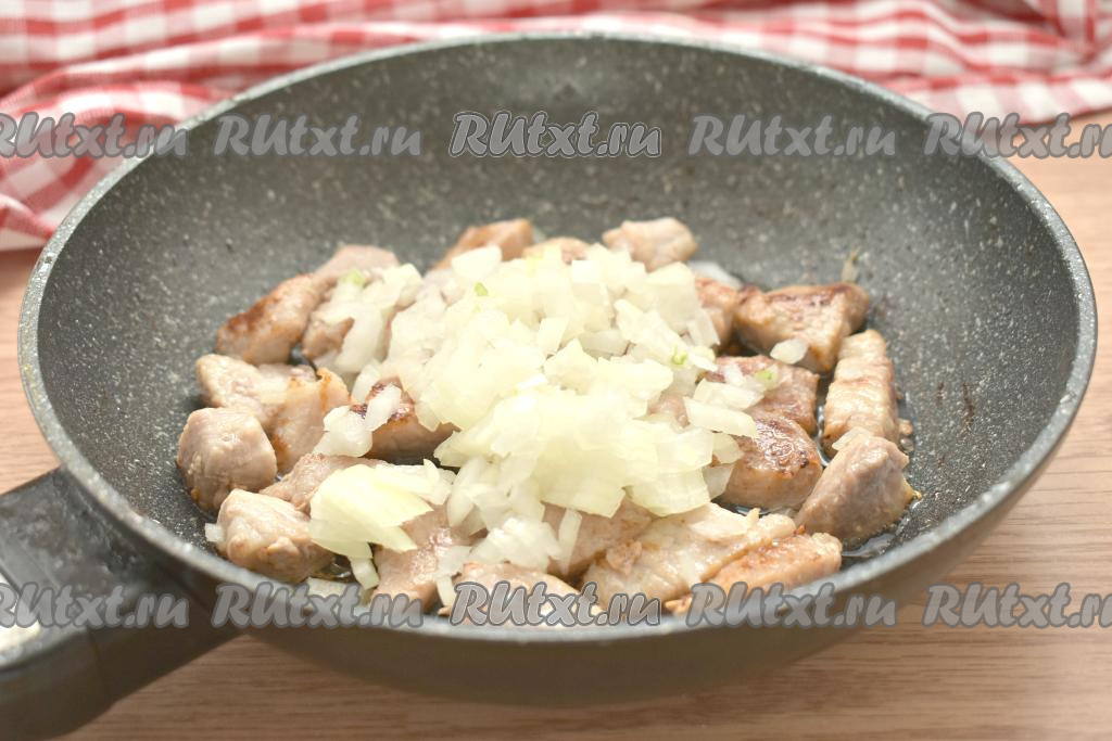 Очищаем лук и морковь. К обжаренной свинине выкладываем лук, нарезанный на небольшие кусочки, перемешиваем и обжариваем 2-3 минуты, иногда помешивая.