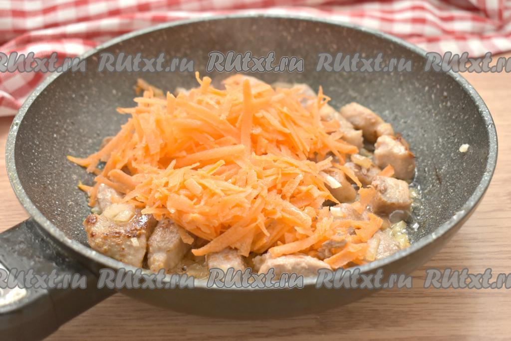 Морковку натираем на крупной тёрке (или нарезаем тонкой соломкой). Когда лук станет достаточно прозрачным, добавляем в сковороду морковь, перемешиваем, обжариваем минут 5 (до мягкости морковки), иногда помешивая.