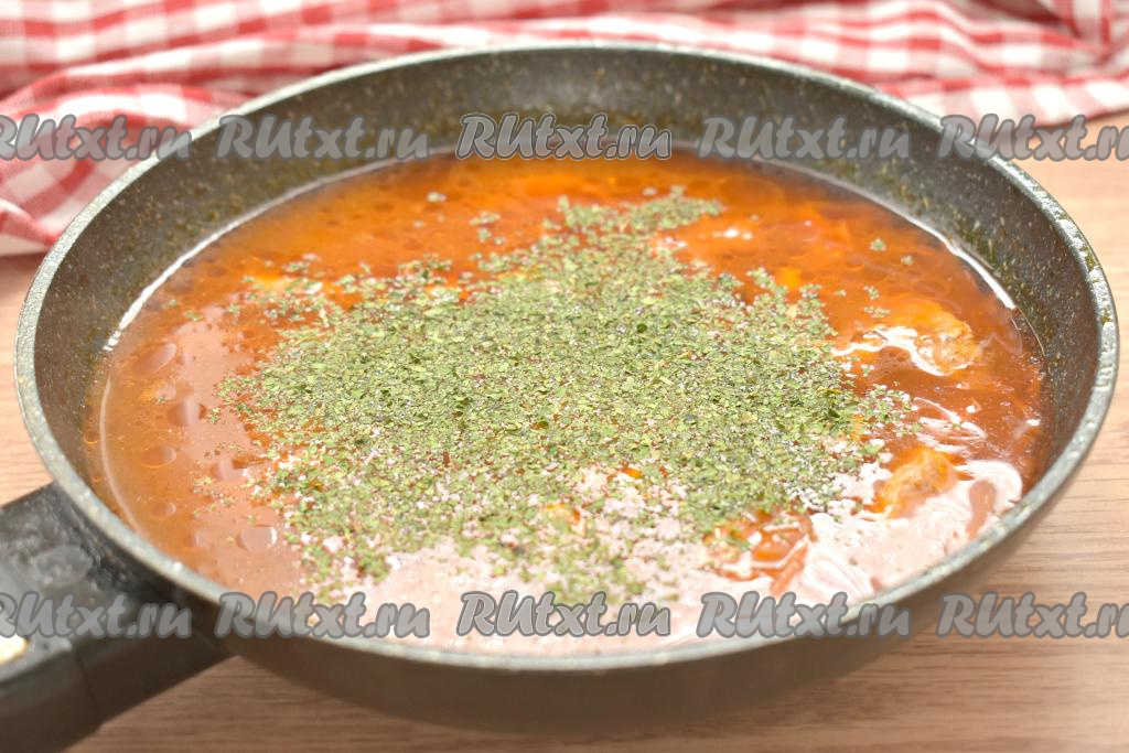Спустя это время вливаем в сковороду 250 миллилитров воды, по желанию, всыпаем немного сушёной зелени, даём соусу закипеть, уменьшаем огонь.