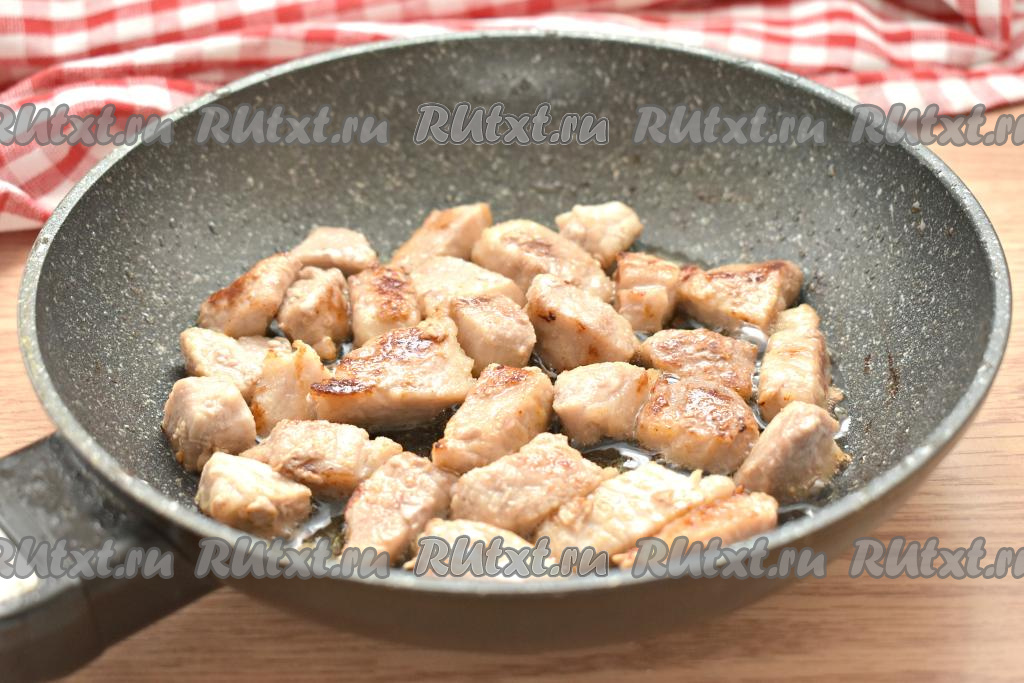 На сковороде разогреваем растительное масло. Выкладываем нарезанную свинину и, периодически перемешивая, обжариваем на среднем огне до появления румяной корочки на кусочках. Мне на обжаривание потребовалось 10 минут.