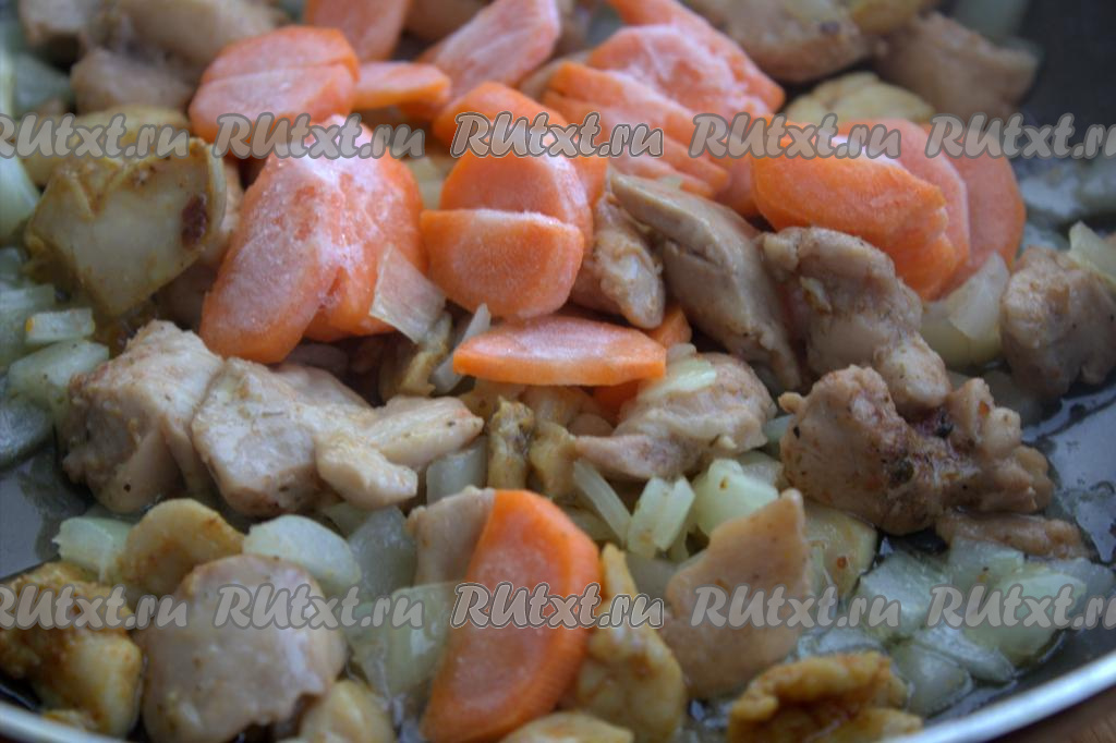 Затем в сковороду добавить очищенную и нарезанную на достаточно тонкие полукружочки (или брусочки) морковь (я взяла замороженную морковку).