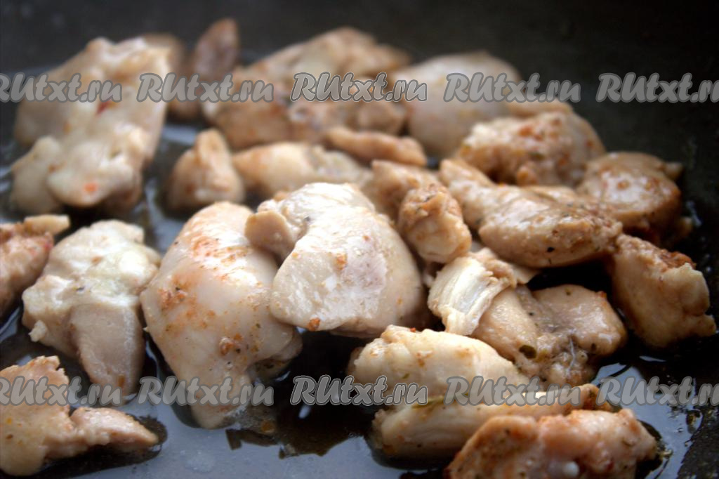 Влить растительное масло в глубокую сковороду, поставить на огонь. В разогретое масло выложить кусочки куриного мяса и обжарить их на среднем огне до появления золотистой корочки со всех сторон.