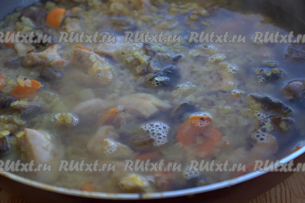 Затем содержимое сковороды аккуратно разровнять, влить горячую кипячёную воду, дать воде закипеть, накрыть сковороду крышкой, огонь уменьшить до минимума. Томить булгур с курицей и грибами на сковороде до готовности крупы и испарения жидкости (минут 15-20). Булгур должен стать рассыпчатым. Готовое блюдо ещё раз хорошо перемешать, накрыть крышкой и дать постоять минут 5.