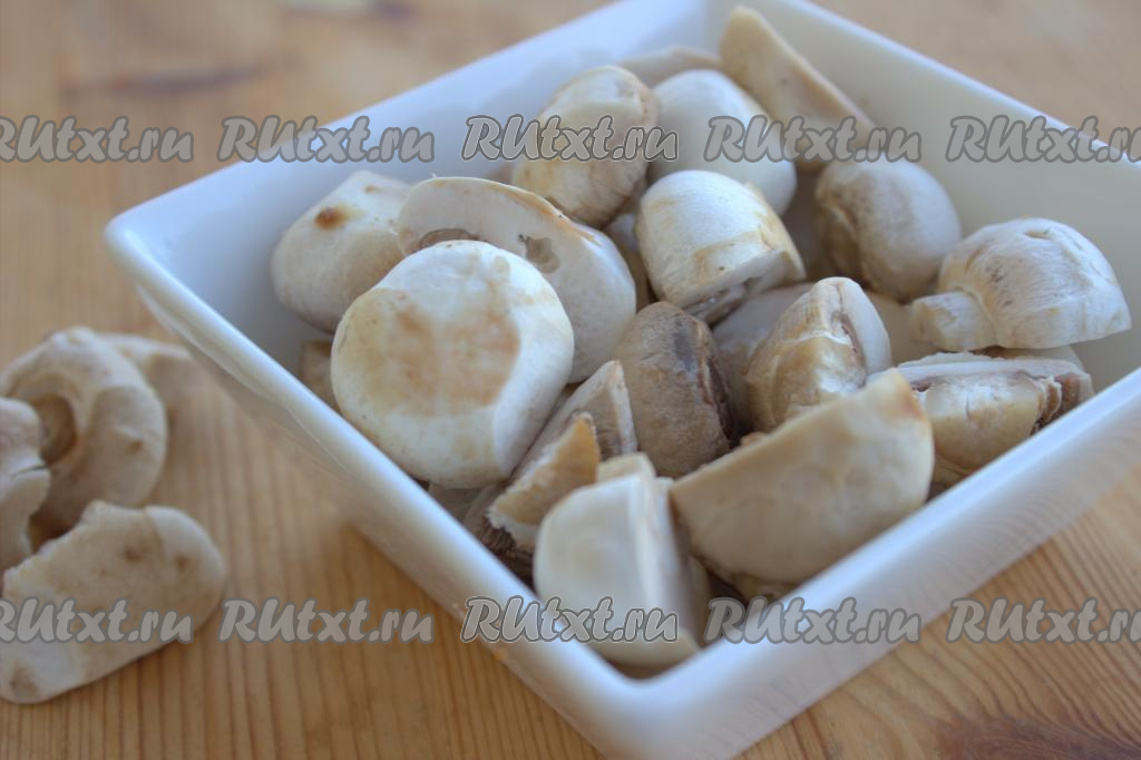Шампиньоны промыть, обсушить, нарезать на средние кусочки. У меня были мелкие грибы. Самые маленькие шампиньоны я разрезала пополам, грибочки чуть покрупнее я разрезала на четвертинки.