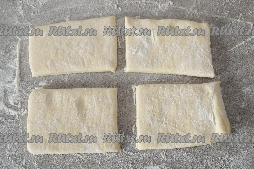 На присыпанную мукой поверхность выложить размороженный пласт слоёного теста, разделить его ножом на 4 равные части.