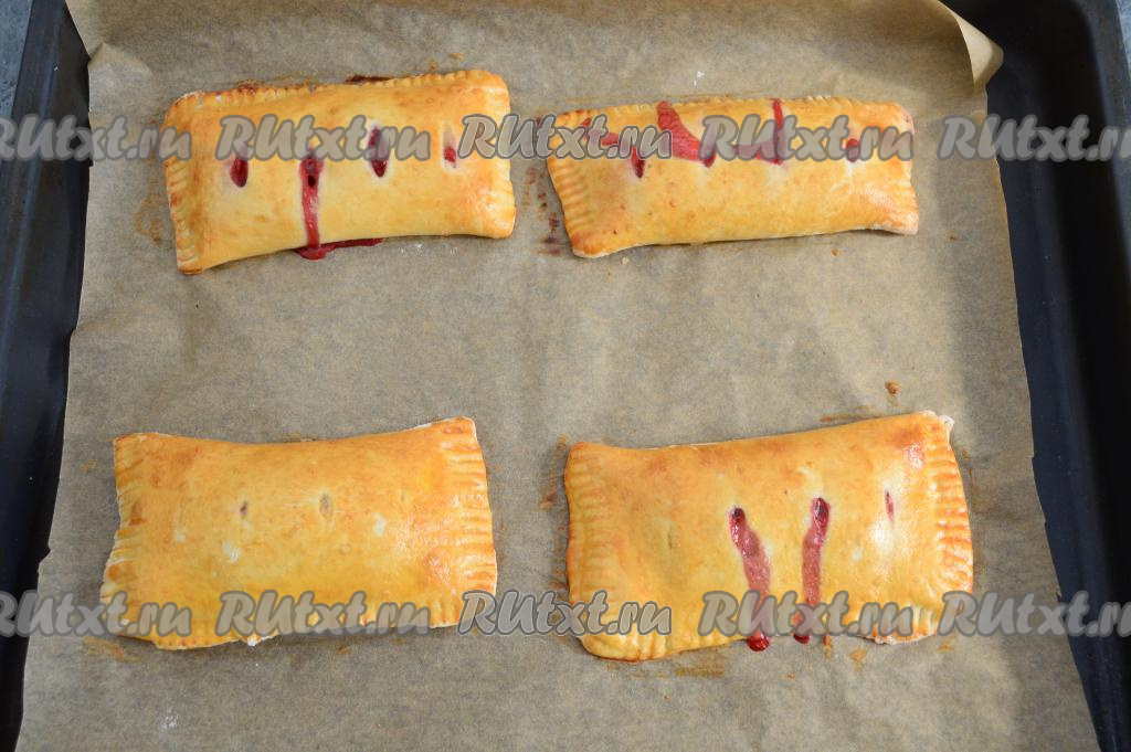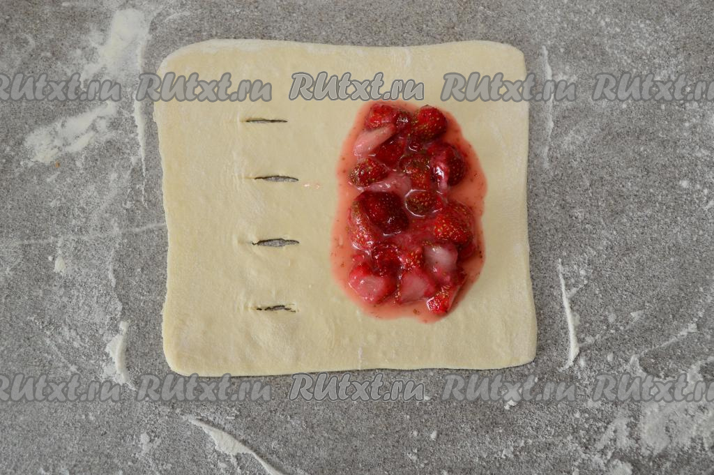 Выпекать слойки с клубникой в разогретой до 180 градусов духовке минут 20-25 (до золотистого оттенка). Во время выпечки из надрезов может вытечь незначительная часть начинки - это нормально.