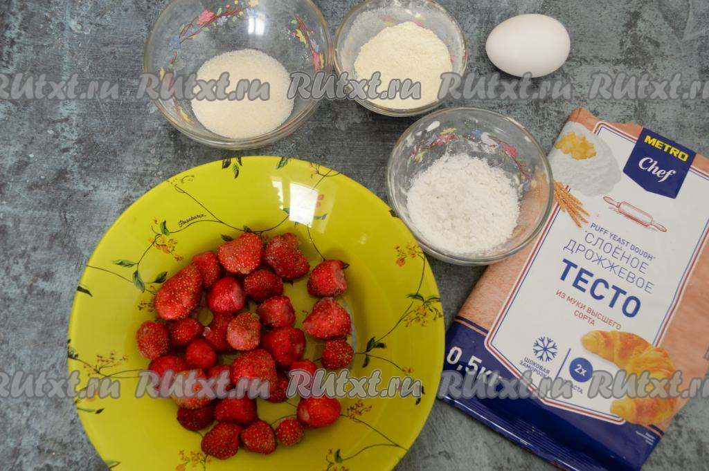 Подготовить продукты. Клубнику достать из морозилки, оставить при комнатной температуре минут на 10, затем лишнюю воду слить. Ягоды не нужно полностью размораживать. Слоёное тесто подойдёт и дрожжевое, и бездрожжевое, достать его из морозилки заранее, чтобы оно разморозилось при комнатной температуре.