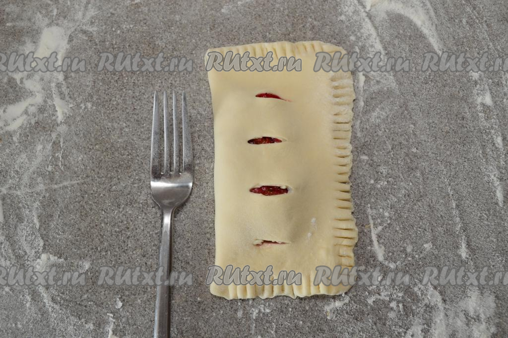 Стороной с разрезами аккуратно накрыть сторону с начинкой (надрезы окажутся сверху). При помощи вилки тщательно скрепить края слойки. Зубцы вилки лучше окунать в муку, тогда они не будут приставать к тесту.