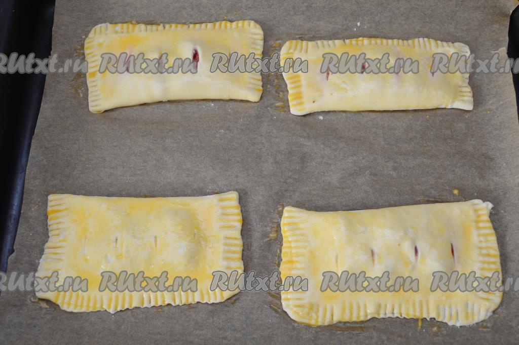 Сформировать таким образом все 4 слойки с замороженной клубникой, переложить их на противень, застеленный пергаментом. В небольшой ёмкости взбить вилкой сырое яйцо. С помощью силиконовой кисточки смазать поверхность слоек яйцом.