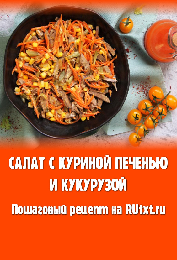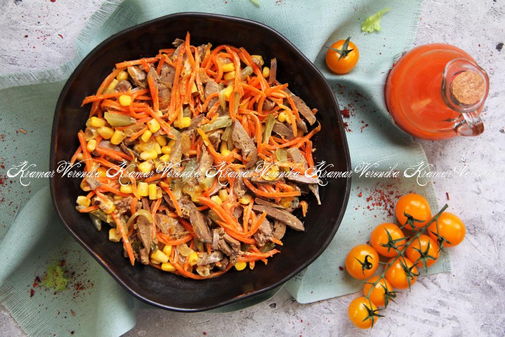 Предлагаю из варёной куриной печени, жареных моркови с луком, консервированной кукурузы и маринованного огурца приготовить яркий, нежный, вкусный салат. Это аппетитное блюдо можно подать и к ужину, и к праздничному столу. Готовится салат достаточно просто, а получается отличным! Всем советую попробовать!