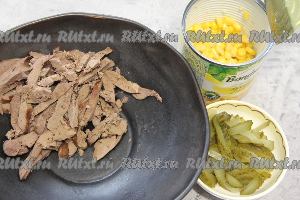 Маринованный огурец и отваренную куриную печень нарезать на длинные брусочки.