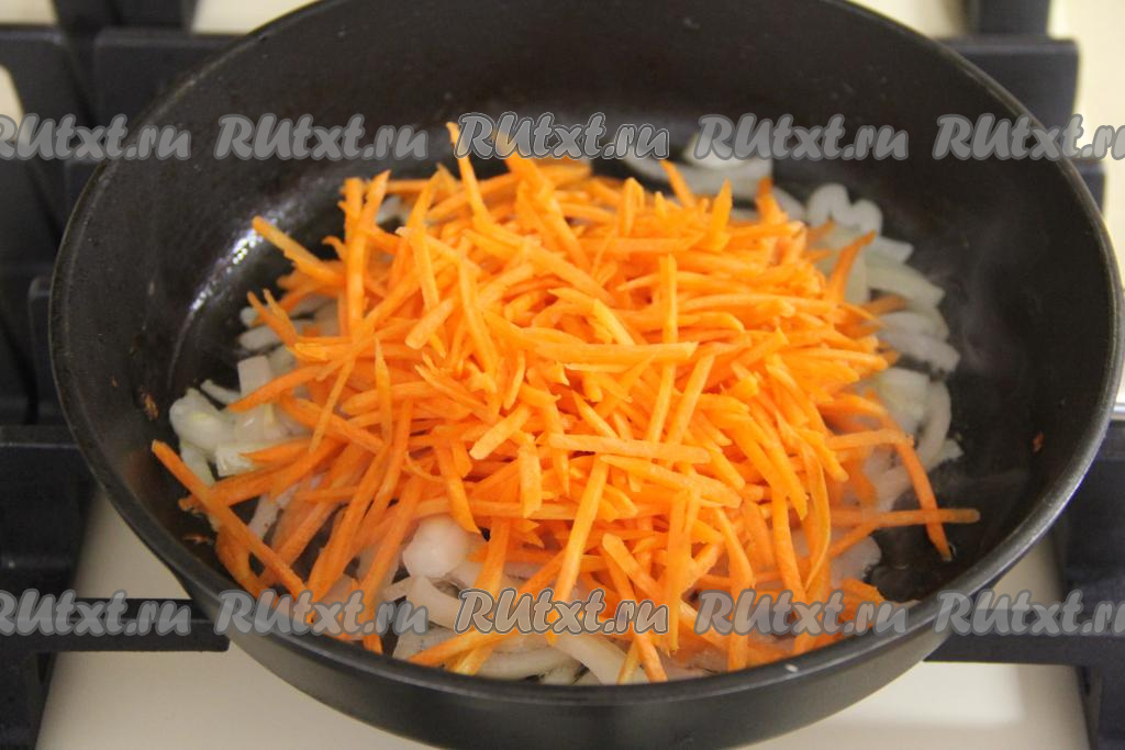 К обжаренному луку выложить морковку, натёртую на тёрке для корейской моркови (или обычной крупной тёрке), перемешать. Обжаривать овощи до мягкости (минут 5-7), иногда помешивая, после этого снять с огня и оставить остывать.
