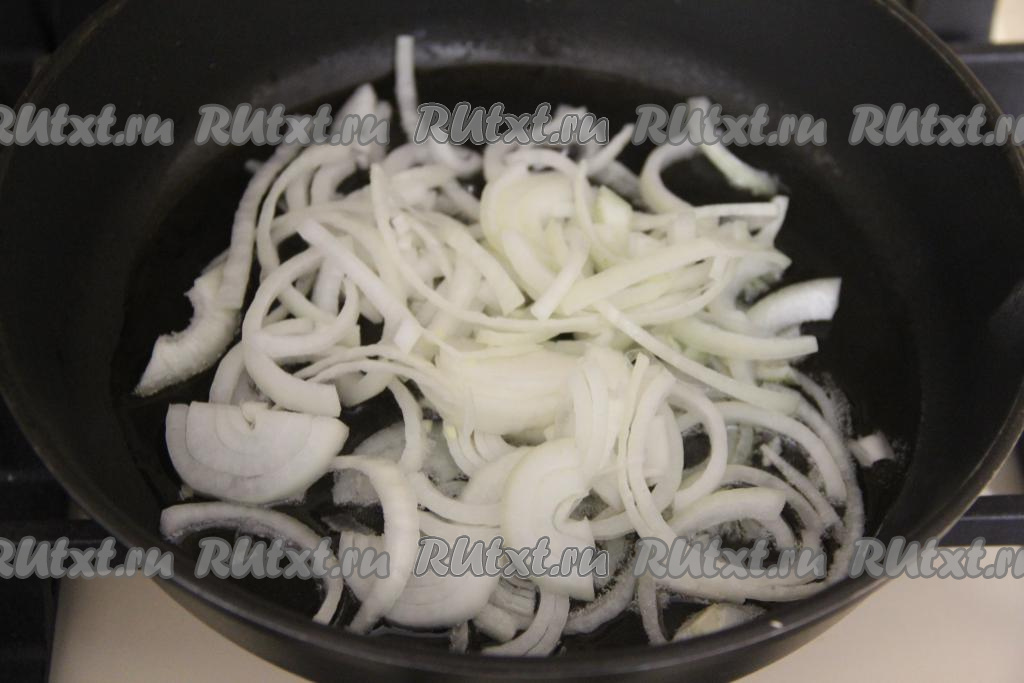 Нарезать очищенную луковицу на тонкие полукольца, выложить в сковороду с растительным маслом и обжарить, иногда помешивая, 2-3 минуты (до прозрачности лука).