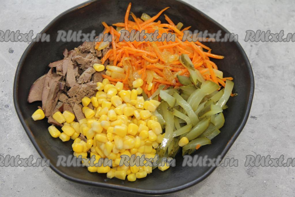 В салатнике соединить куриную печень, огурчик, кукурузу без жидкости и жареные лук с морковью, подсолить салат по вкусу (добавляя соль, учитывайте, насколько солёные огурцы вы используете).