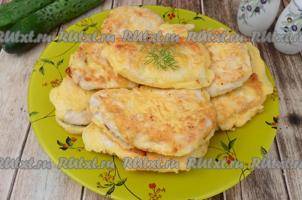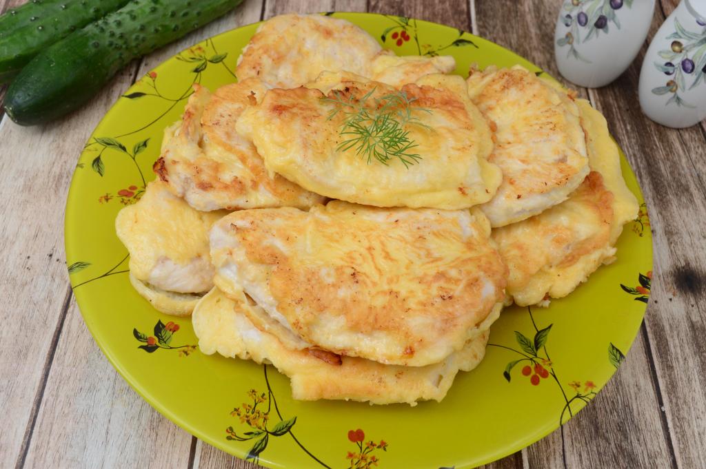 Готовность мяса можно проверить, разрезав кусочек филе (разрез должен быть белого цвета, без розоватых вкраплений). Сложить готовые отбивные на отдельное блюдо. Постепенно пожарить оставшиеся кусочки куриного филе, покрывая их кляром из сметаны.