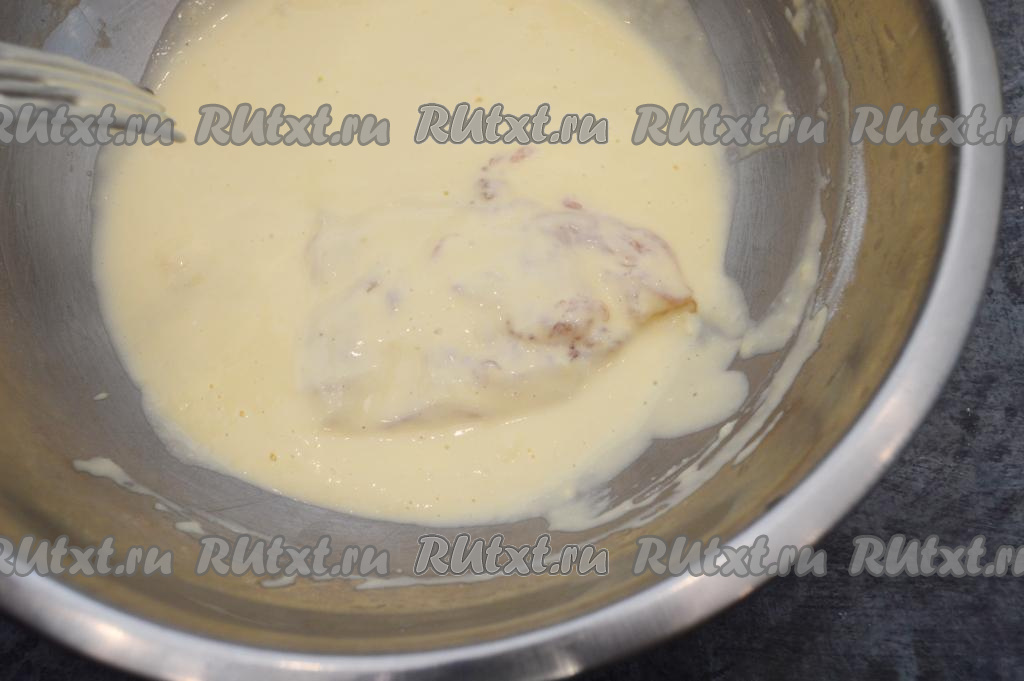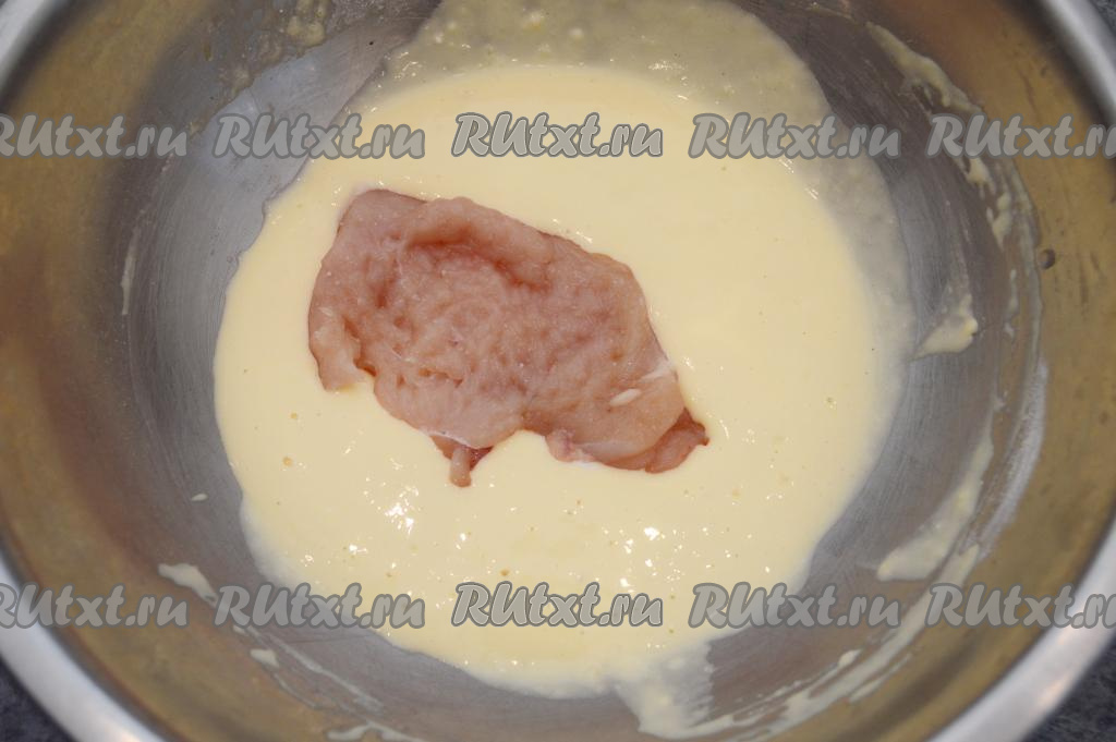 После того как кляр будет готов, сразу поставить на огонь разогреваться сковороду с растительным маслом. Куриную отбивную окунуть в сметанный кляр.