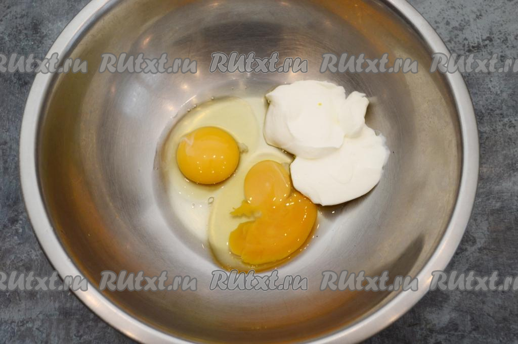 Приготовить сметанный кляр, для этого в глубокой миске соединить сметану и яйца.