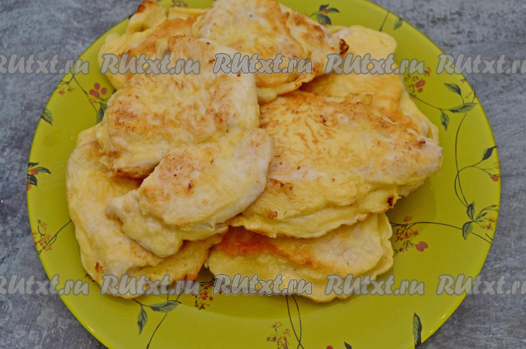 Мягкое, сочное, нежнейшее куриное филе, приготовленное в сметанном кляре, лучше подавать к столу в горячем виде, дополнив любимым гарниром.