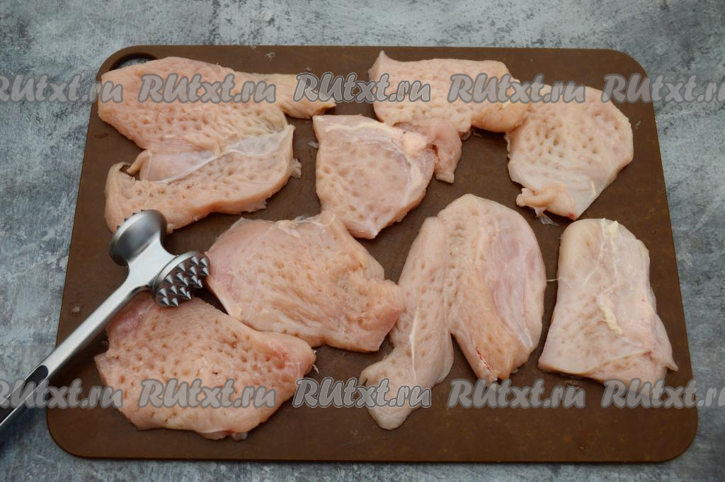 Куриное филе нарезать на пласты толщиной примерно 1 сантиметр и отбить кулинарным молоточком. Отбивные посолить по вкусу.