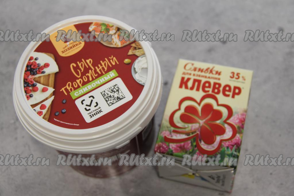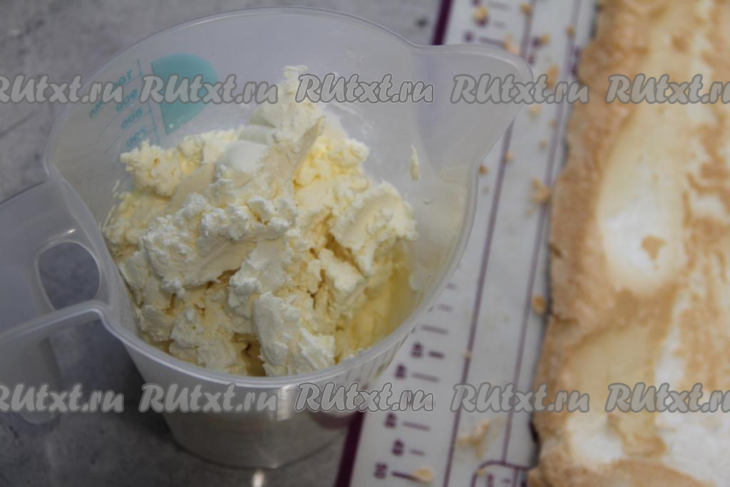 Сливочно-творожный крем лучше начать готовить минут за 10-15 до готовности меренгового коржа. Сливки должны быть хорошо охлаждёнными. Творожный сыр нужно достать из холодильника минут за 30 до начала приготовления крема.