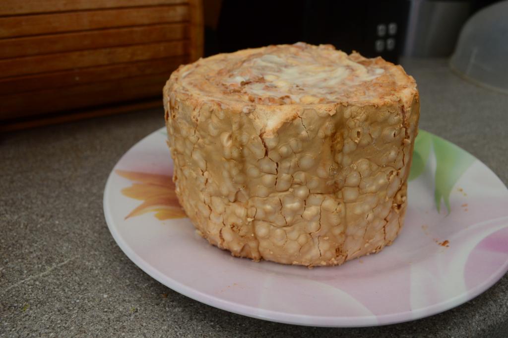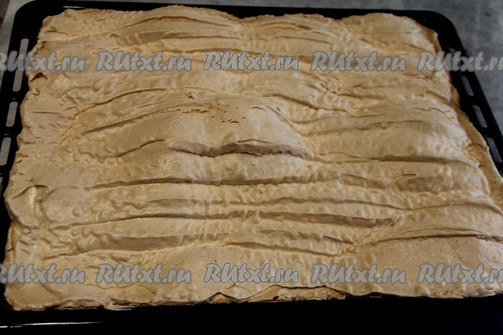 Выпекать меренговый корж в разогретой духовке минут 30 при температуре 160 градусов. Поверхность коржа должна стать хрупкой, кремового цвета.