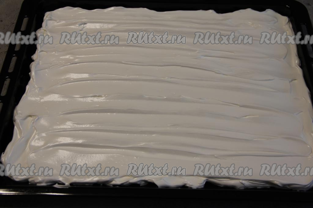 Противень (у меня противень размером 45 на 30 сантиметром) застелить ковриком для выпечки (или бумагой для выпечки). Выложить взбитые белки и аккуратно разровнять.