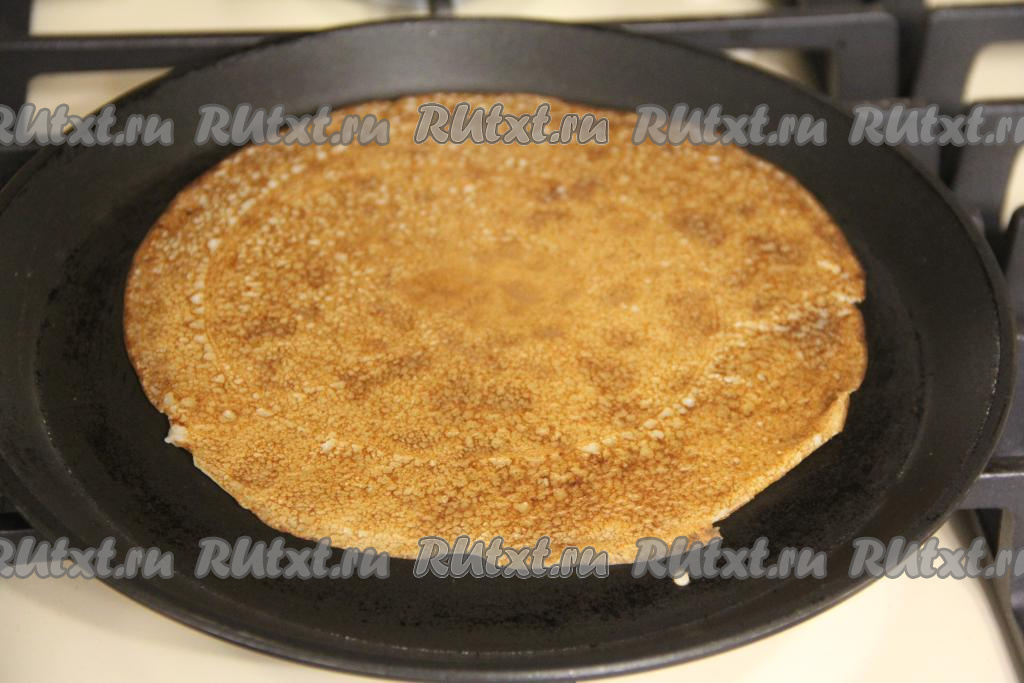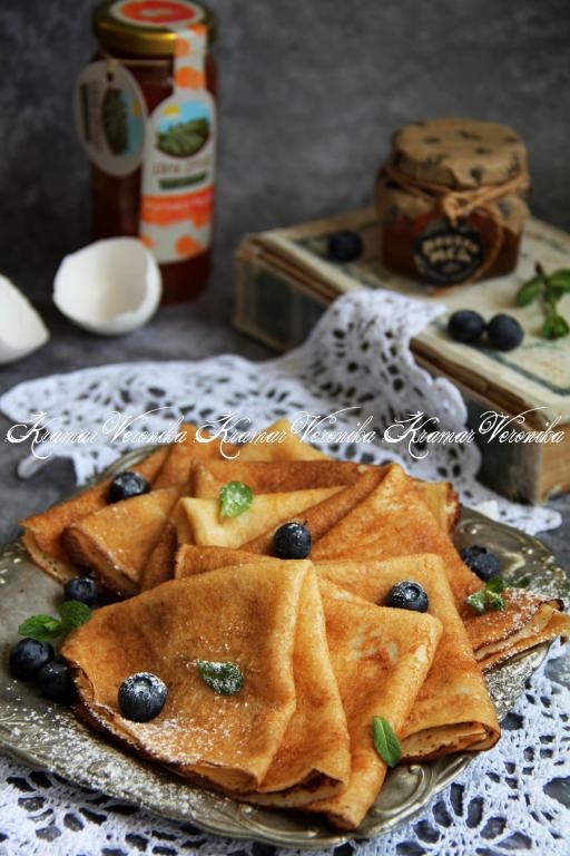 Сковороду (я использовала сковородку диаметром 20 сантиметров) смазать немного маслом, хорошо разогреть, уменьшить огонь до среднего, влить половник теста. Равномерно распределить блинное тесто по дну сковородки и жарить блинчик с двух сторон до золотистого цвета, затем переложить на тарелку. Периодически перемешивая тесто, постепенно пожарить все блины, складывая их горкой на тарелку. В процессе жарки блинчики хорошо переворачиваются. Сковороду после жарки первого блина я не смазывала, так как масло входит в состав блинного теста, но здесь важно ориентироваться на качестве покрытия сковороды. Из указанного количества ингредиентов у меня получилось 18 румяных блинов.