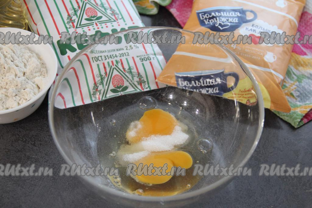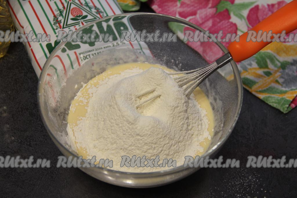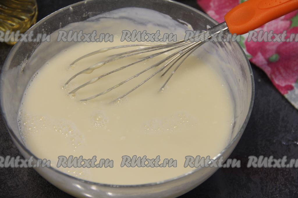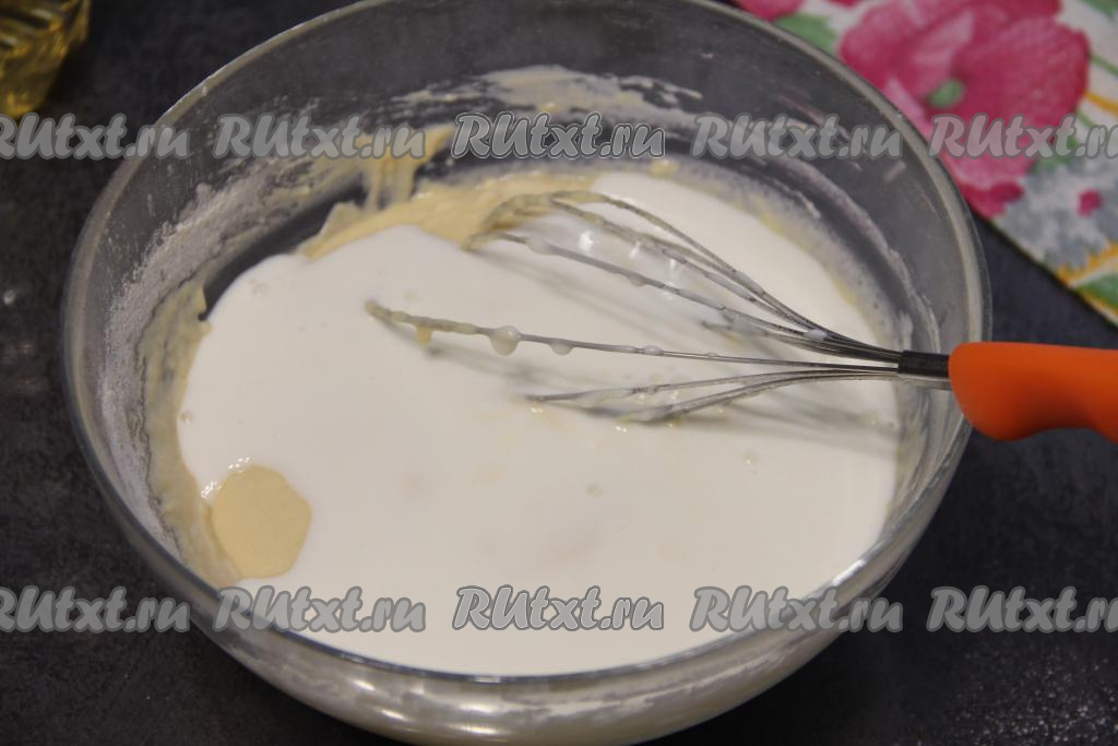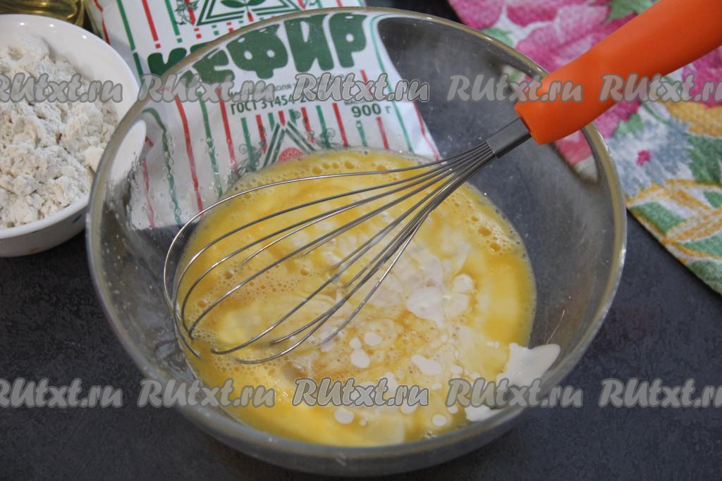 В яичную смесь влить ряженку, перемешать венчиком.