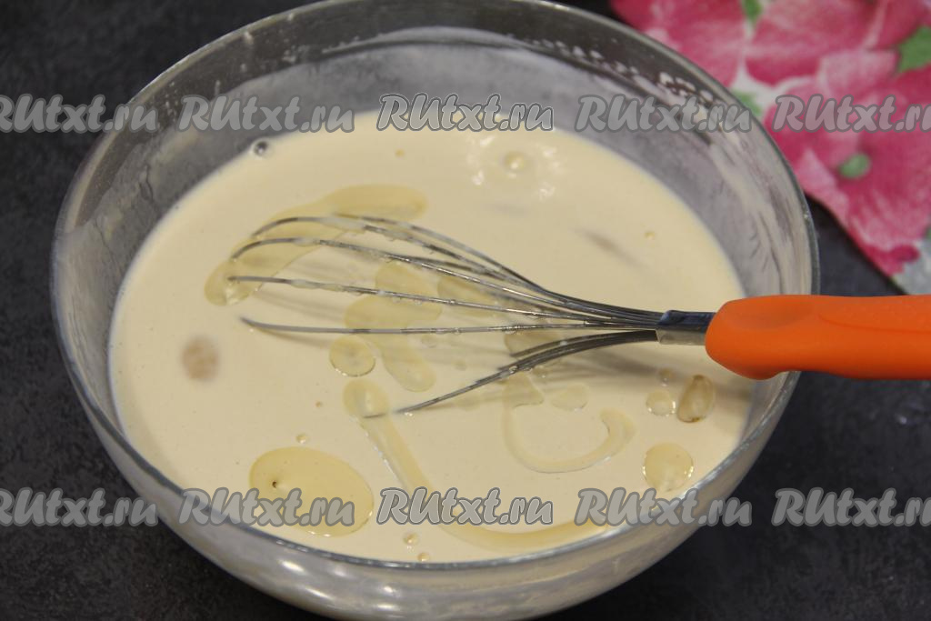 Влить 2 столовых ложки растительного масла, перемешать и оставить блинное тесто на 15 минут "отдохнуть". Тесто получится не жидким, но и густым оно не будет.
