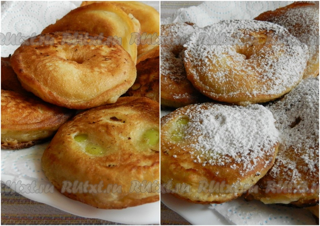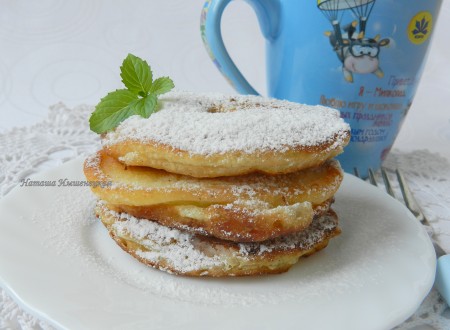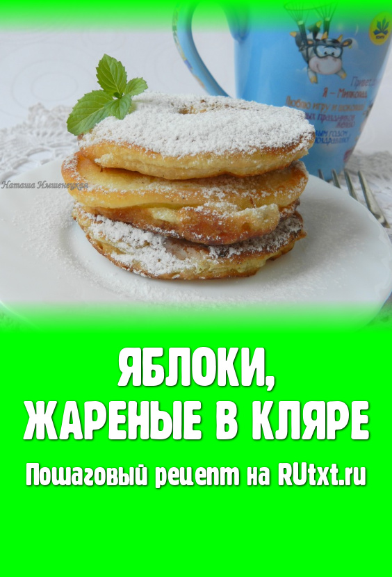Яблоки, жареные в кляре, перекладывать со сковороды на салфетку, чтобы стекло лишнее масло, и ещё горячими посыпать их сахарной пудрой. Постепенно обжарить все кружочки яблок, покрытые кляром.