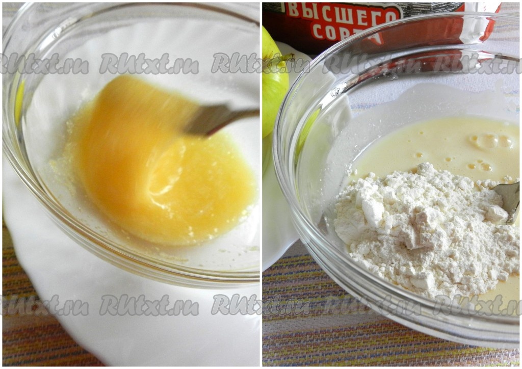 Прежде всего нужно приготовить кляр, для этого в миске нужно взбить яйцо с сахаром и солью вилкой до однородности, затем добавить сметану, по желанию, всыпать корицу, перемешать до однородности. Всыпать 2 столовых ложки муки и разрыхлитель, хорошо перемешать. Частями добавляя оставшуюся муку и перемешивая вилкой, замесить кляр, который по густоте будет напоминать в меру густую сметану.