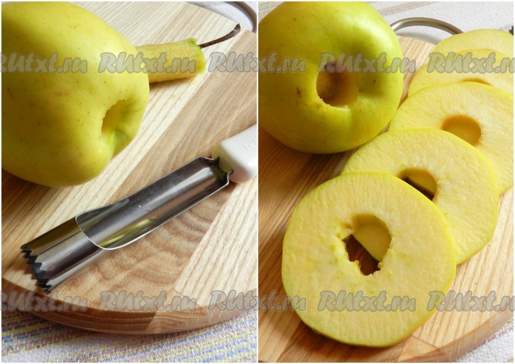 У яблок вырезать сердцевину. Нарезать яблоки на колечки толщиной примерно 0,5 сантиметров.