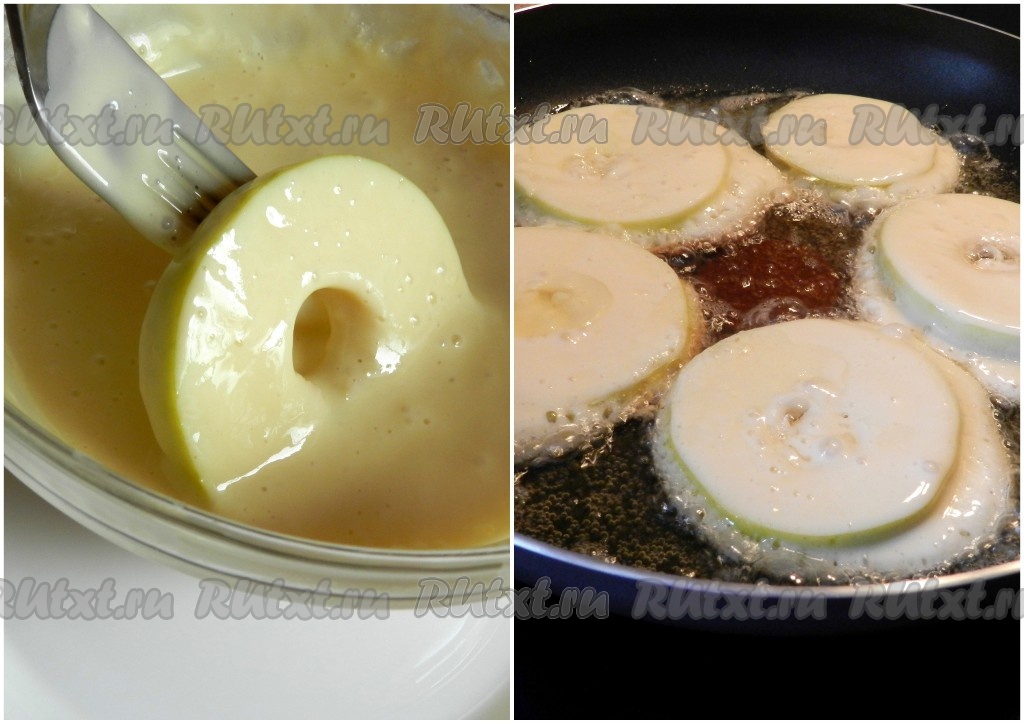 В сковороде разогреть растительное масло. Нарезанные яблоки помещать в кляр, покрывая яблочные колечки кляром со всех сторон. Выкладывать яблоки в кляре в разогретое масло и жарить, как оладьи, на среднем огне до подрумянивания с двух сторон.