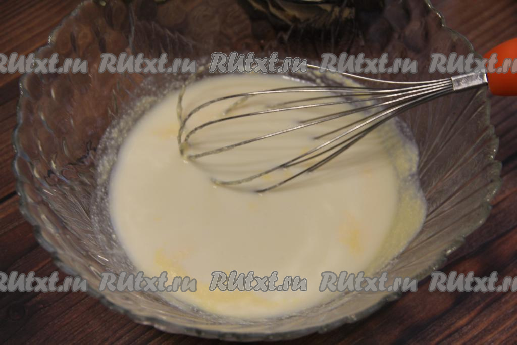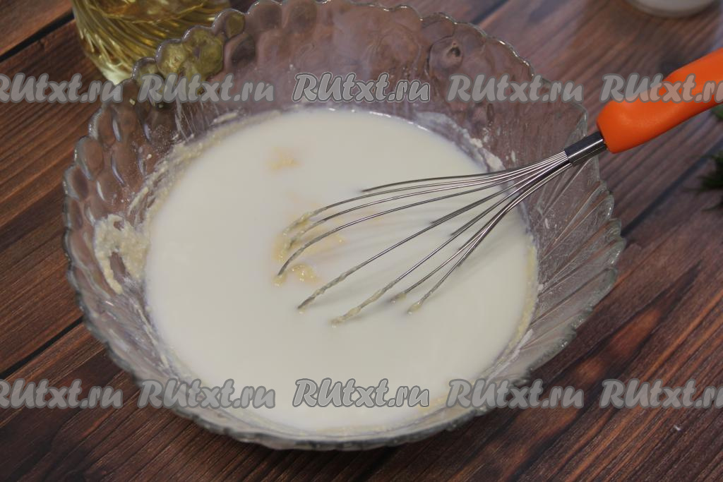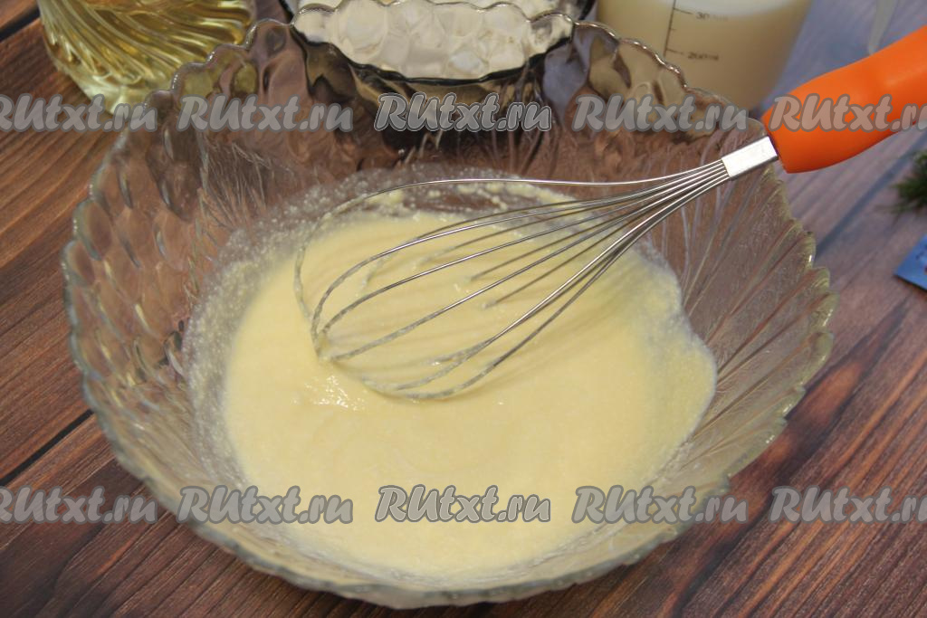 Затем всыпать муку и разрыхлитель, перемешать творожное тесто для блинов венчиком до однородного состояния.