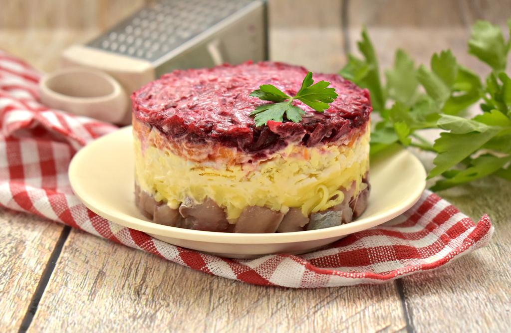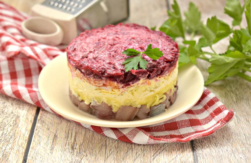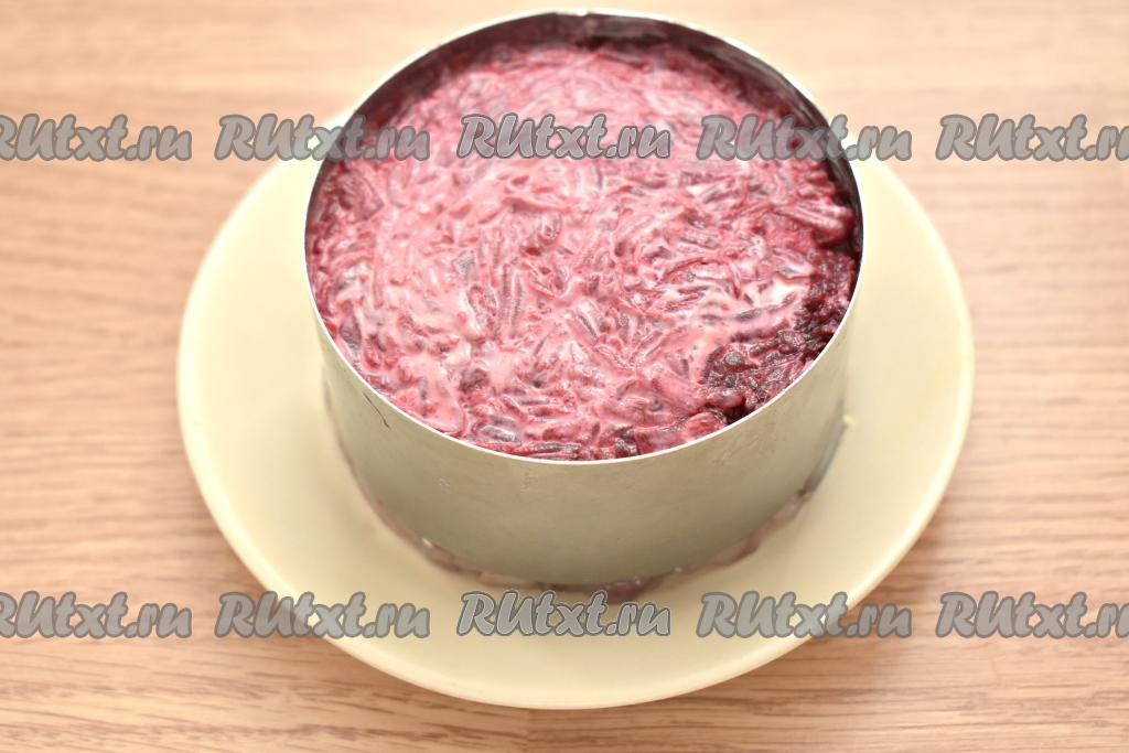 Завершающим слоем будет натёртая на крупной тёрке свекла, смазываем её майонезом.