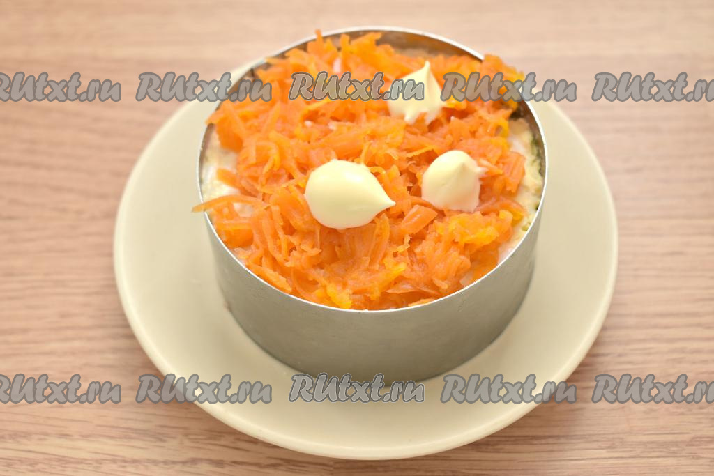 Поверх яиц равномерно распределяем варёную морковку, натёртую на крупной тёрке, этот слой тоже покрываем майонезом.