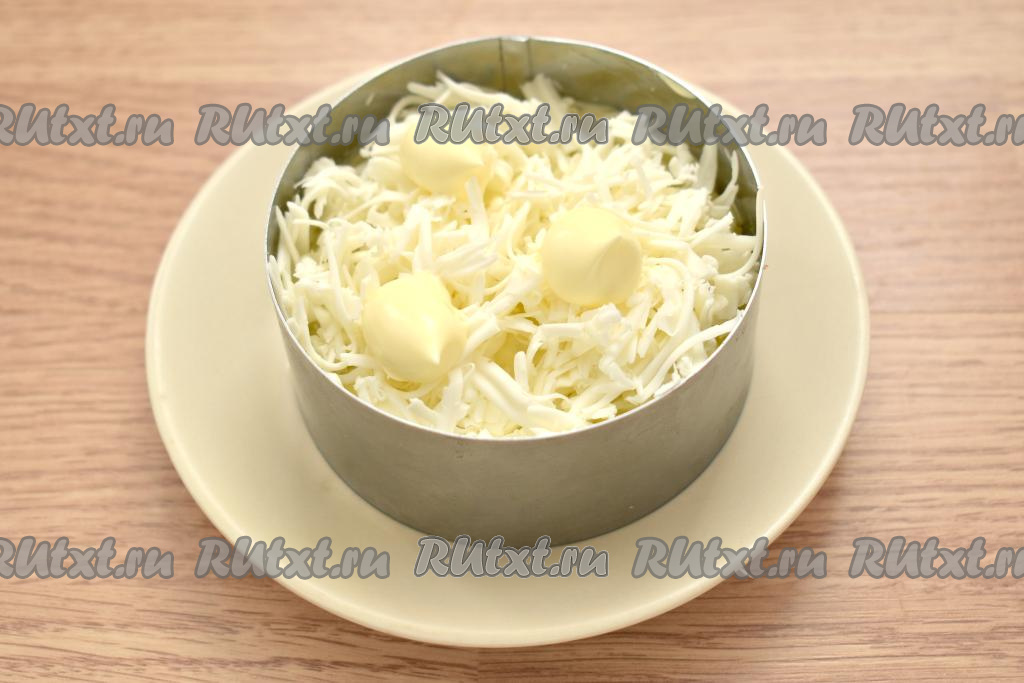 Плавленный сыр, натёртый на крупной тёрке, раскладываем следующим слоем, смазываем немного майонезом.
