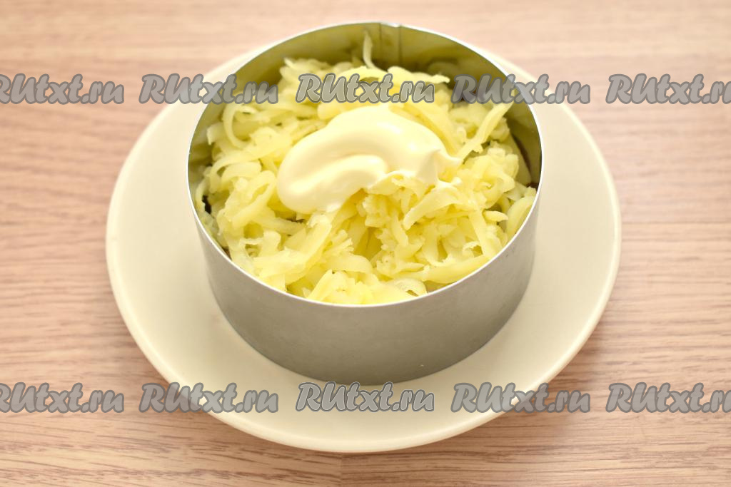Поверх сельди равномерно раскладываем натёртый на крупной тёрке картофель, смазываем его майонезом.