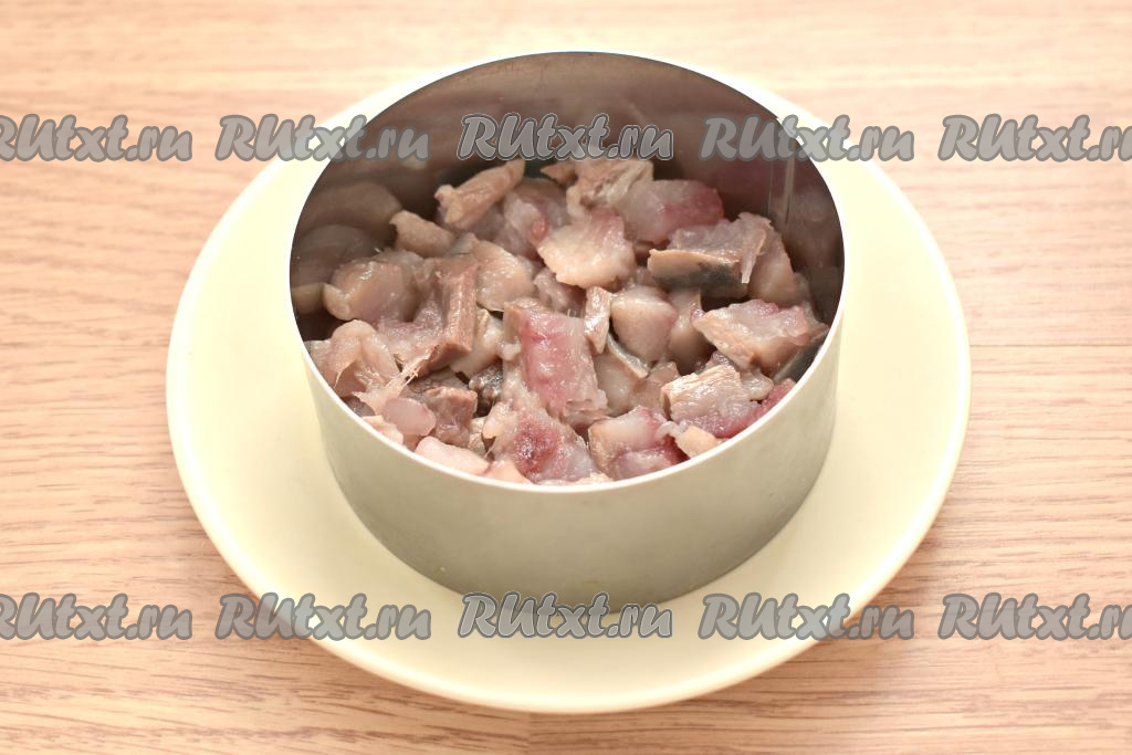 Ставим сервировочное кольцо на плоскую тарелку. Филе солёной сельди нарезаем на небольшие кубики и выкладываем первым слоем.
