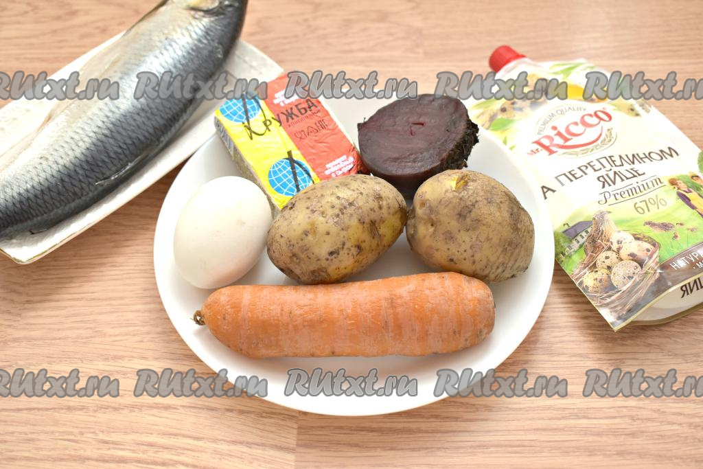 Отвариваем заранее картошку (в течение 20 минут с момента закипания воды) и морковку (варим 25-30 минут после начала кипения воды). Отдельно варим свеклу (в течение 45-60 минут после закипания воды). Отвариваем яйца в течение минут 10 с момента закипания воды. Даём картошке, свекле, моркови и яйцам остыть, а очищаем их уже непосредственно перед формированием салата. Плавленный сыр минут на 10 убираем в морозилку, чтобы его проще было натирать. Если используете целую селёдку, тогда разделываем её на филе, убирая голову, плавники и косточки. Для этого салата потребуется 1 филе сельди (то есть половина селёдки). Готовить "Селёдку под шубой" можно в общем салатнике или порционно. Я формировала салат на плоской тарелке с помощью сервировочного кольца. Ингредиентов хватит на 2-3 порции.