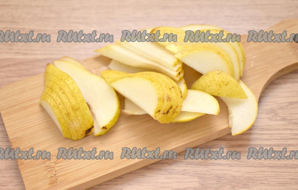 Грушу тщательно промываем, разрезаем на четвертинки, удаляем семечки и нарезаем на тонкие ломтики.
