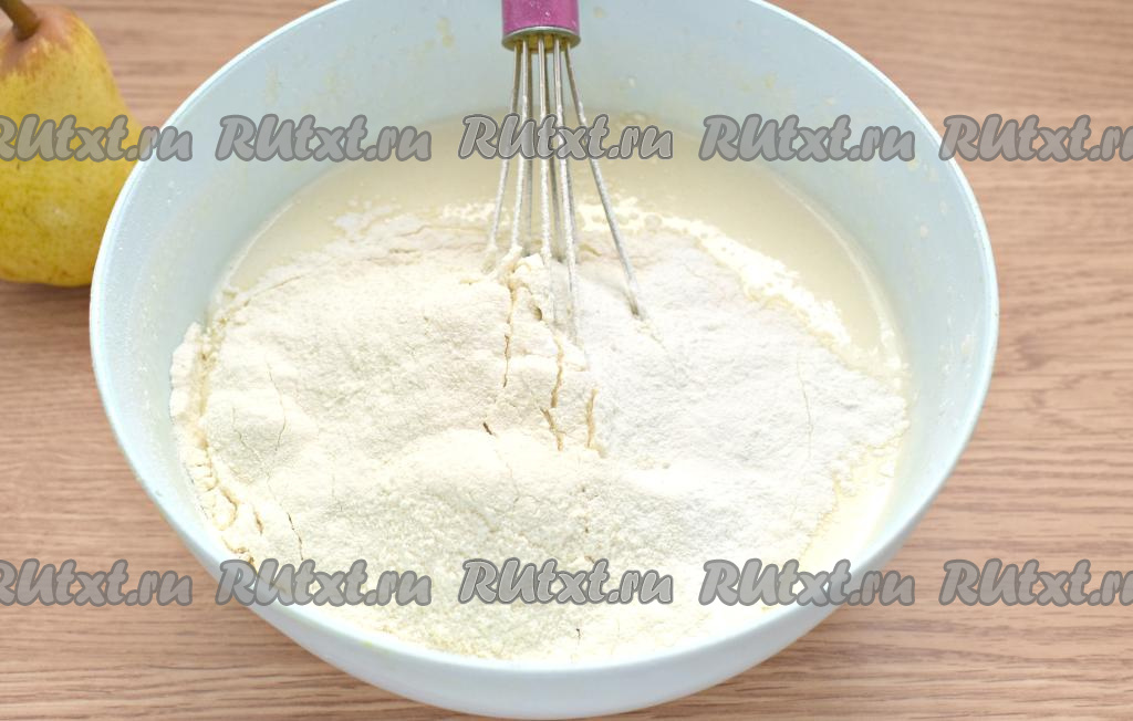 В образовавшуюся смесь просеиваем часть пшеничной муки вместе с разрыхлителем, всыпаем соль, перемешиваем венчиком (или ложкой).