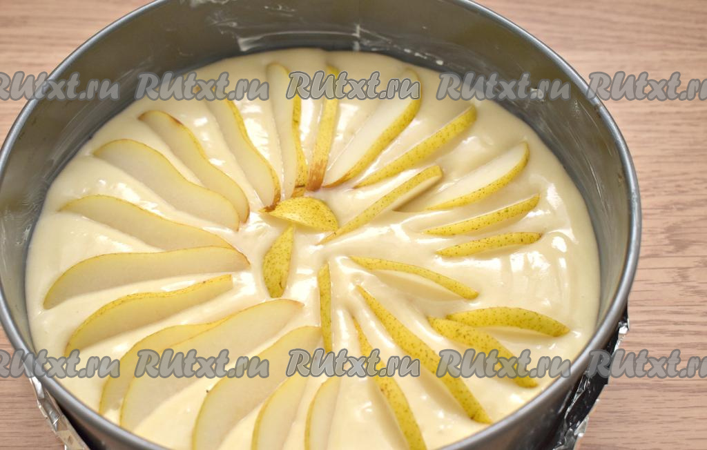 Форму для выпечки (я пекла в форме диаметром 20 сантиметров) смазываем сливочным маслом, выкладываем тесто. Сверху распределяем ломтики груш, немного вдавливая их в тесто.