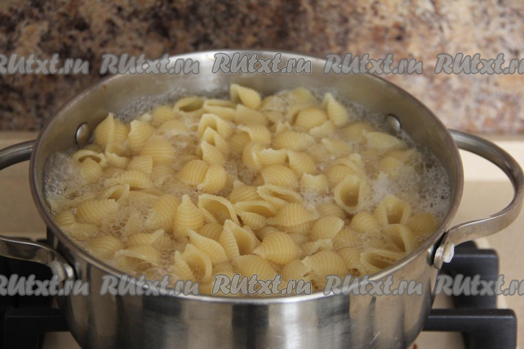 Макароны любой формы выложить в кастрюлю с кипящей подсоленной водой и после закипания варить на небольшом огне до готовности (время варки смотрите на упаковке макарон, которые вы готовите, обычно на отваривание требуется от 8 до 10 минут). Затем откинуть их на дуршлаг и промыть холодной водой.