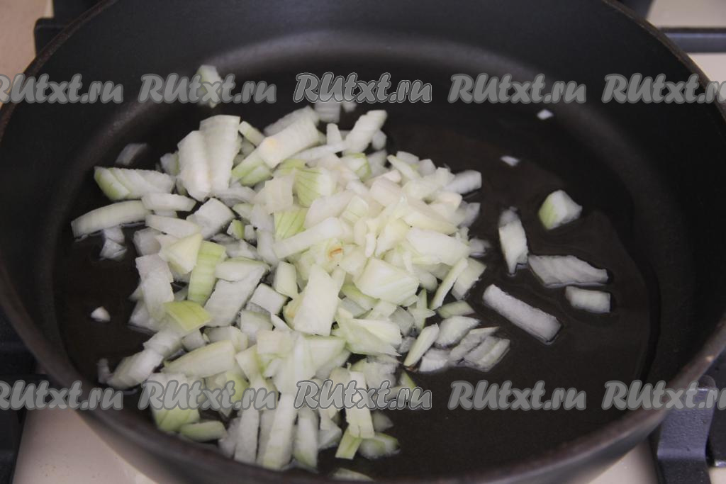 Лук почистить и мелко нарезать. В сковороду с высокими бортиками влить растительное масло, поставить на огонь, после этого выложить лук и обжарить его на среднем огне до прозрачности (в течение 2-3 минут), периодически перемешивая.