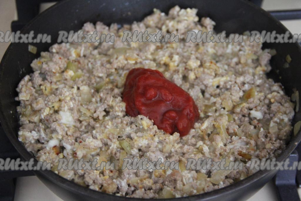 Перемешать фарш с яйцами и специями. Жарить 10 минут, периодически перемешивая фарш с яйцами. Затем добавить томатную пасту. К моменту добавления пасты фарш уже должен быть готовым.